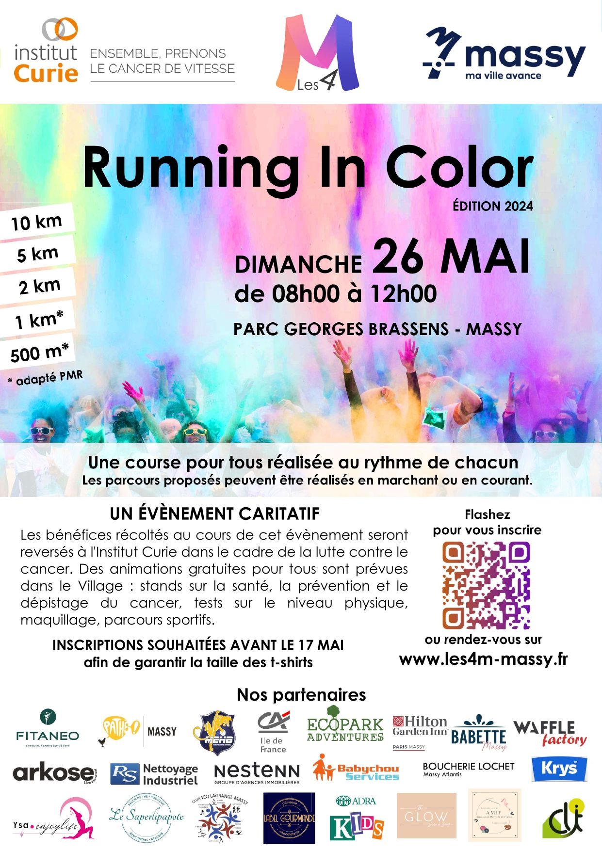 Nous organisons le dimanche 26 mai 2024 à partir de 08h00 notre Running In Color dans le parc Georges Brassens à Massy. Les bénéfices récoltés seront reversés à l'Institut Curie dans le cadre de la lutte contre le cancer.