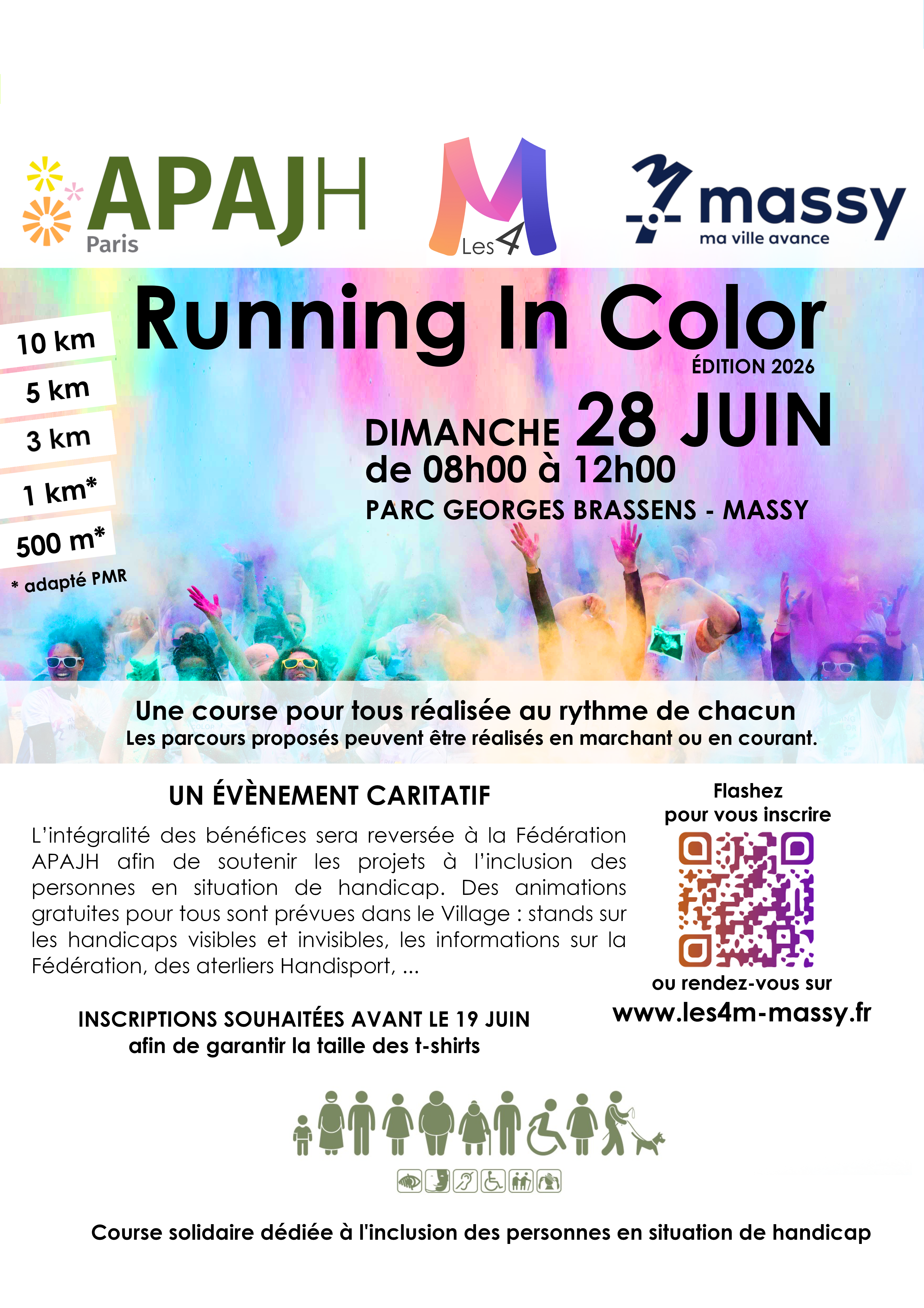 Nous organisons le dimanche 28 juin 2026 à partir de 08h00 notre Running In Color dans le parc Georges Brassens à Massy. Les bénéfices récoltés seront reversés à l'APAJH pour les projets qui portent l’inclusion des personnes en situation de handicap.